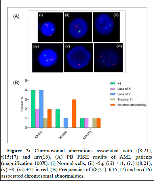 Figure 2: Chromosomal aberrations associated with t(8;21), t(15;17) and inv(16). (A) PB FISH results of AML patients (magnification 100X). (i) Normal cells, (ii) -5q, (iii) +11, (iv) t(8;21), (v) +8, (vi) +21 in red. (B) Frequencies of t(8;21), t(15;17) and inv(16) associated chromosomal abnormalities.