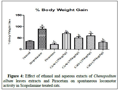 For pharmacological activity Wistar rats weighing 150-200 g were randomly divided in to seven groups (n=6/ group). Group Ð served as normal control and received vehicle; group ÐÐ served as scopolamine control and received vehicle; group ÐÐÐ standard drug piracetam (150 mg/kg, i.p.); groups ÐV and V were administered with ethanolic extract of Chenopodium album leaves (250 and 500 mg/kg respectively, p.o.) and groups VÐ and VÐÐ received aqueous extract of Chenopodium album leaves (250 and 500 mg/kg respectively, p.o.). All treatments were given orally and intraperitoneal started after 14 days inject Scopolamine (except normal control group) and continued for 14 days along with Scopolamine.