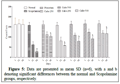 Figure 5: Data are presented as mean SD (n=6), with a and b denoting significant differences between the normal and Scopolamine groups, respectively.