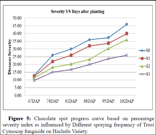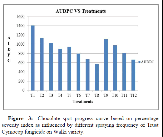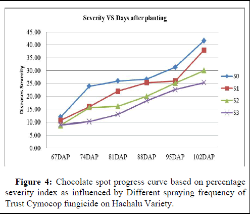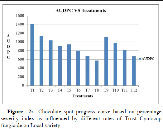 The disease severity was recorded from 12 pre-tagged plants in each plot. The disease severity of chocolate spot was recorded starting from the onset of disease in 7-days interval for three times using a 0–9 rating scale. The severity grades were converted into Percentage Severity Index (PSI) according to the formula by Wheeler.