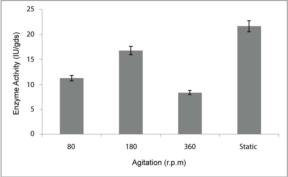 | Effect of agitation: PME production in batch culture was conducted under three different agitation speeds (80, 180, 360 rev/min and stationary) under constant air supply throughout the fermentation batch. The effect of agitation speed on PME production was shown on Figure 5. Highest PME production was 21.6 U/gds/min which was obtained at stationary condition |