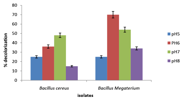 | The results of the screening and identification of bacteria isolated from the effluent samples confirmed by using standard microbiological procedures, API 20E and API 20NE. Figure 1 illustrate the effect of different carbon sources on decolorization of azo dye by Bacillus cereus and Bacillus megaterium. Percentage decolorization of the dye recorded for Bacillus cereus when glucose was used as carbon source was 20% and that for Bacillus megaterium was 15%. The percentage of decolorization of azo dye with sucrose as carbon source was found to be 76% and 8%, respectively for B. cereus and Bacillus megaterium. When meso-inositol was used as carbon source 20% and 18% decolorization of the dye was recorded in cultures of Bacillus cereus and Bacillus megaterium, respectively. From the above data it is observed that Bacillus cereus is more efficient in decolorizing azo dye than Bacillus megaterium and sucrose is the ideal carbon source for its activity under “in vitro” condition. Figure 2 illustrates the effect of different nitrogen sources on decolorization of azo dye by Bacillus cereus and Bacillus megaterium. Percentage decolorization of the dye recorded for Bacillus cereus when beef extract was used as nitrogen source was 10% and that for Bacillus megaterium was 15%. The percentage of decolorization of azo dye with peptone as nitrogen source was found to be 82% and 74%, respectively for Bacillus cereus and Bacillus megaterium. When the yeast extract was used as nitrogen source 68% decolorization of the dye was recorded with both the bacterial species. From the above data it is observed that Bacillus cereus is more efficient in decolorizing azo dye than Bacillus megaterium and peptone is the ideal nitrogen source for its activity under in vitro condition. Figure 3 illustrates the effect of different temperature on decolorization of azo dye by Bacillus cereus and Bacillus megaterium. Percentage decolorization of the dye recorded for Bacillus cereus at 27°C was 58% and that for Bacillus megaterium was 62%. The percentage of decolorization of azo dye at 37°C was found to be 64% and 68%, respectively for Bacillus cereus and Bacillus megaterium. From the above data it is observed that Bacillus megaterium is more efficient in decolorizing azo dye than Bacillus cereus and 37°C is the ideal temperature for its activity under “in vitro” condition. Figure 4 illustrates the effect of different pH on decolorization of azo dye by Bacillus cereus and Bacillus megaterium. Percentage decolorization of the dye recorded for both Bacillus cereus and Bacillus megaterium at pH 5 was 25%. Decolorization of azo dye at pH 6 was found to be 36% and 70%, respectively for Bacillus cereus and Bacillus megaterium. The percentage of decolorization of azo dye at pH 7 was found to be 48% and 54%, respectively for B. cereus and Bacillus megaterium. When the cultures were maintained at pH 8, 15% and 34% decolorization of the dye was recorded in cultures of Bacillus cereus and Bacillus megaterium, respectively. From the above data it can be inferred that Bacillus megaterium is more efficient in decolorizing azo dye than Bacillus cereus and pH 6 is the ideal for its activity under “in vitro” condition. Figure 5 illustrates the effect of different volume of inoculums on decolorization of azo dye by Bacillus cereus and Bacillus megaterium. Percentage decolorization of the dye recorded for B. cereus for 2% inoculum was 70% and that for Bacillus megaterium was 60%. The percentage decolorization of azo dye with 4% inoculum was found to be 78% and 64%, respectively for Bacillus cereus and Bacillus megaterium. The percentage decolorization of azo dye with 6% inoculum was found to be 68% and 65%, respectively for Bacillus cereus and Bacillus megaterium. The percentage decolorization of the dye recorded for Bacillus cereus with 8% inoculum was 82% and that for Bacillus megaterium was 74%. When 10% inoculums were used 70% and 73% decolorization of the dye was recorded in cultures of Bacillus cereus and Bacillus megaterium, respectively. From the above data it is observed that Bacillus cereus is more efficient in decolorizing azo dye than Bacillus megaterium and 8% inoculum is the ideal volume for its activity under “in vitro” condition. Figure 6 illustrates the Time course of dye decolorization of azo dye under optimum conditions by Bacillus cereus and Bacillus megaterium. Percentage decolorization of the dye recorded for Bacillus cereus was 95% at 1% sucrose 0.25% peptone, pH 7, 37°C and 8% inoculum and that for Bacillus megaterium was 98% at glucose 1%, 0.25% yeast extract, pH 6, 37°C and 10% inoculum. The outcomes of this experiment indicated that Bacillus megaterium performed the decolorization process to a better extent than Bacillus cereus under a combination of the ideal levels of all factors influencing the process. However, both the species of bacteria can be inferred as good agents for the degradation of azo dye red. Azo dyes represent one of the recalcitrant chemicals not being degraded by conventional effluent treatment processes [29]. Bacteria have been recognized as an important and efficient agent for the degradation and decolorization of textile dyes [10-12]. Bacillus cereus has been reported to decolorize different azo dyes from textile effluent. Modi et al. [30] have reported maltose and peptone as the ideal carbon and nitrogen sources, respectively for efficient decolorization of Reactive Red 195 by B. cereus, recording 97% reduction in color of the dye in the effluent. In another study Ola et al. [31], have reported decolorization of Cibacron red P4B and Cibacron black PSG to the levels 81% and 75%, respectively by this species. Further the study [31] has reported requirement of different carbon and nitrogen sources for maximum decolorization of the two dyes. The current study has revealed 95% decolorization of azo dye red with sucrose and peptone as ideal carbon and nitrogen sources, respective