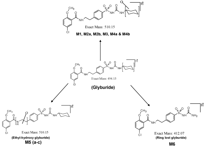 | Incubation of mouse liver microsomes with parent drug glyburide results in monohydroxylated metabolites [5], and ring loss metabolite [6]. Structures of the cyclohexyl monohydroxy glyburide have been characterized in the previous work [5,8]. For example: 4-trans-hydroxy cyclohexyl glyburide, 4-cis-hydroxy cyclohexyl glyburide, 3-trans-hydroxy cyclohexyl glyburide, 3-cis-hydroxy cyclohexyl glyburide and 2-trans-hydroxy cyclohexyl glyburide have been synthesized as materials, and their retention time were compared with the retention time of metabolites found in the incubation mixture. Thus, the structure of the formed metabolites in the incubation mixture is confirmed. Among the synthesized materials, two of the materials, i.e. 4-trans-hydroxy cyclohexyl glyburide and 3-trans hydroxyl cyclohexyl glyburide exhibit hypoglycemic activity; however, its activity is less than that of the parent drug glyburide [13]. This suggests the importance of identification of metabolites, and testing those metabolites for activity and potency in animal models. For example, popular drugs such as Acetaminophen, Oxazepam, and Cetrizine, etc. in the market are identified as metabolites, and later developed as a drug. Similarly, many metabolites are developed as a better drug than those of the parent drug [14]. In this context, identification of metabolites, prediction of important metabolites and synthesis of metabolites, and subjecting those metabolites for preclinical studies gains importance for the following reasons. |